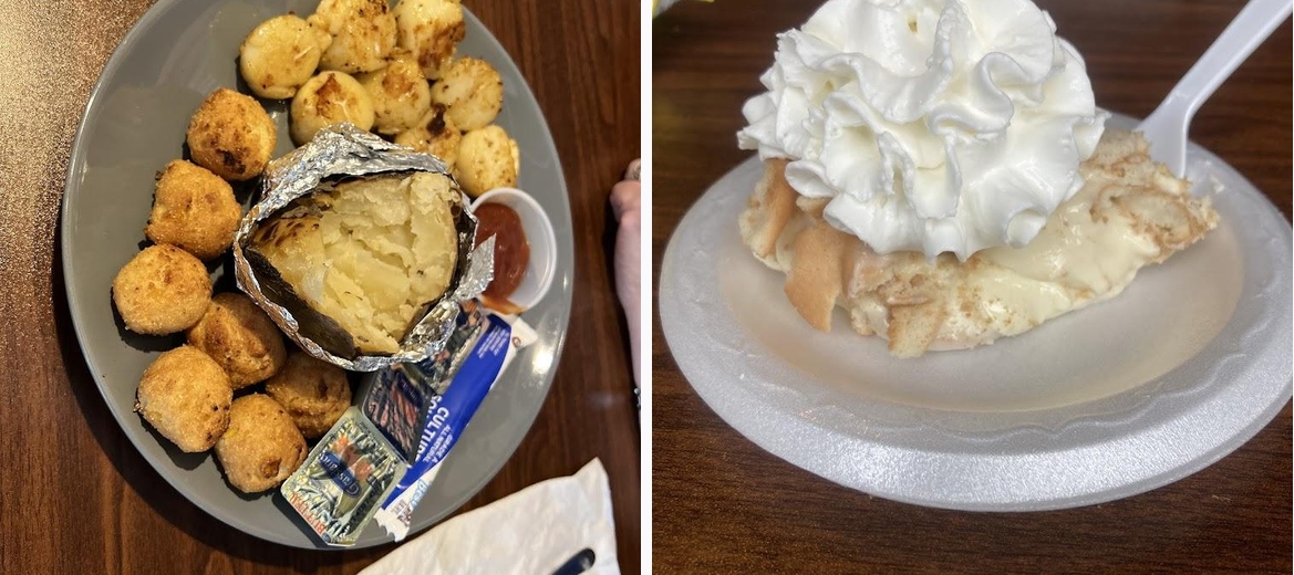 The food is good! I got the flounder sandwich. It was delicious! The only issue I had was closing the sandwich because of the fish. So maybe if it’s cut in there or maybe getting a wider loaf of bread, would make this meal a little simpler to eat. The hush puppies were some of the best I’ve ever had. The banana pudding was nothing special, but it was delicious. Overall, I would definitely come back!